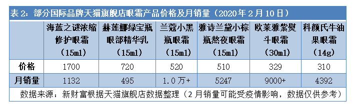在眼霜领域,国际品牌把持了中高端,竞争优势更加明显,知名度较高的奢侈品线有海蓝之谜一系列精华眼霜、赫莲娜绿宝瓶,高端线有雅诗兰黛小棕瓶、兰蔻小黑瓶,中端市场也有欧莱雅的紫熨斗、科颜氏的牛油果等提供高性价比选择(表2)。