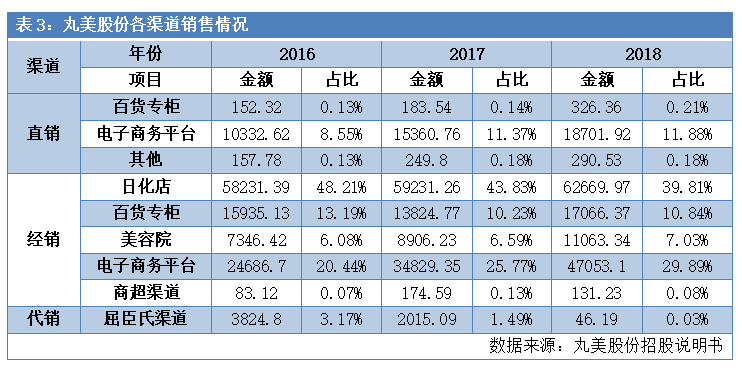 分布广泛的日化店,是丸美最主要的经销渠道。截至2018年底,其主品牌“丸美”入驻1万多家日化店、1700多家大众百货和数千家美容院。2005到2012年,是日化专营店蓬勃发展的时期,丸美借助这一渠道实现了营收的跨越式增长。2016年,其日化店渠道的销售额占比为48.21%,是丸美销售额占比最大的渠道,2018年这一渠道仍贡献了39.81%的销售额(表3)。