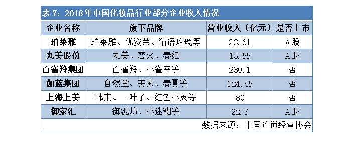 2018年,上海家化的化妆品业务收入为23.55亿元,只占总收入的33.1%,个护业务收入是化妆品业务的两倍。除了珀莱雅和丸美,未上市的百雀羚、伽蓝集团(自然堂母公司)、上美(韩束一叶子母公司)在化妆品核心业务上都已经超越上海家化(表7)。核心业务化妆品占比较低,使得毛利低估值低,是上海家化短期内难以改善的劣势。