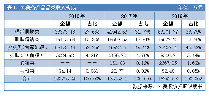 眼霜、精华、面霜为护肤品中附加值最高的品类,具有功能成分含量高、单件容量小、价格高的特点,因此毛利率也相对较高。丸美从眼霜起家,如今仍以眼霜作为主导产品,2016年,其眼部产品的收入占比为27.63%,2018年已经提升至33.79%,在所有品类中占比最高(表1)。