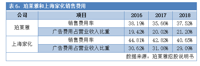 并非只有丸美的销售费用率比较高,整个化妆品行业都是如此。珀莱雅的销售费用在35-40%之间,广告费占总营收的比重在2成左右;而上海家化的销售费用率更高达40%以上,广告费占总营收比重在3成左右(表6)。