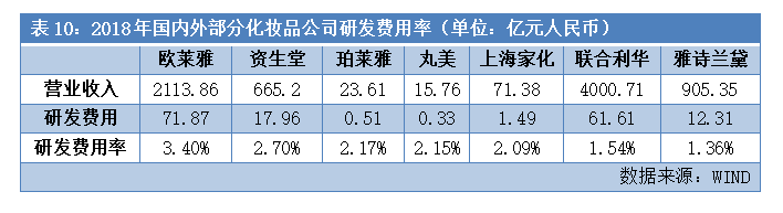 欧莱雅研发费用率为3.4%,资生堂为2.7%,国产品牌珀莱雅、丸美和上海家化紧随其后