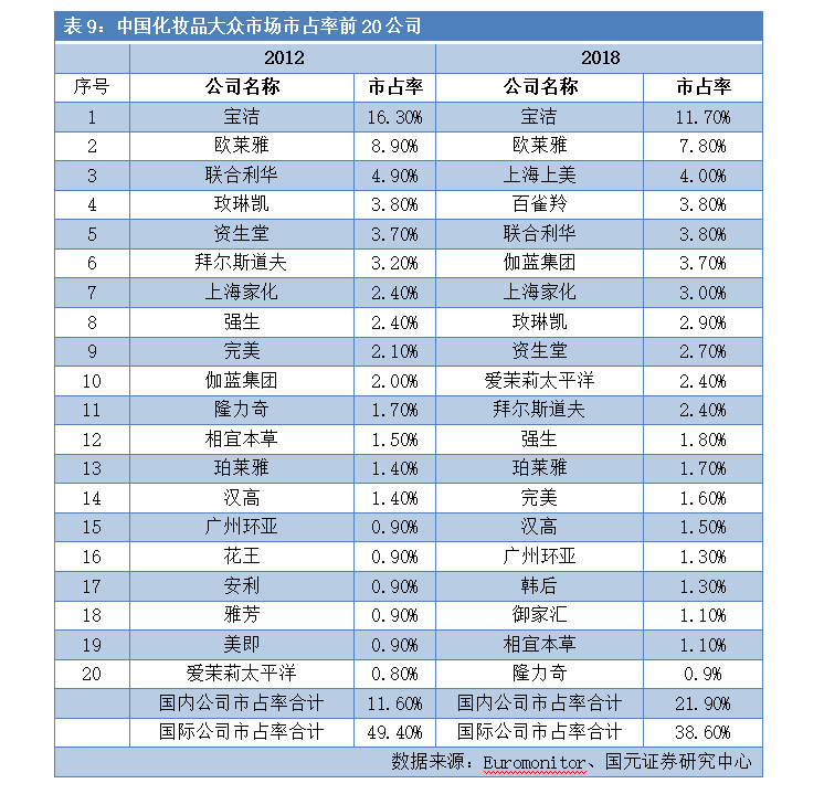 在大众市场,国内公司在逐步挤占国际品牌的位置,但2018年头部公司仍以国际品牌为主。宝洁和欧莱雅的龙头地位从2012年保持到了2018年,但两者市场份额都已经下降,联合利华则退出前三强。
