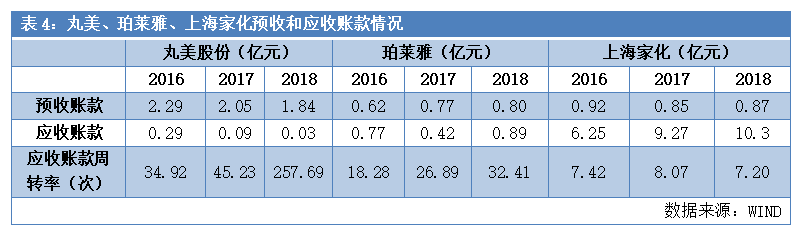 和丸美非常相似,珀莱雅和上海家化也主要依靠经销商渠道,公司的应收账款和预收账款大部分来自于经销商(表4)。
