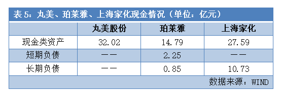 正是因为丸美对经销商较为“严格”,回款能力强,丸美的现金状况也明显比珀莱雅和上海家化要好(表5)。