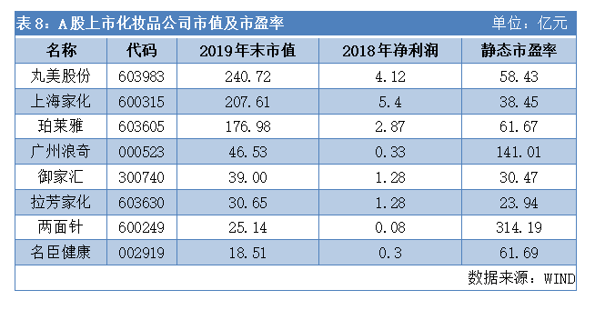 2017年珀莱雅上市前,A股并没有纯粹的化妆品企业,除了上海家化,两面针(600249)、白猫股份(目前已退市)、广州浪奇(000523)、拉芳家化(603630)以及名臣健康(002919)等都只能算是泛日化板块,规模较小,市值也较小(表8)。而珀莱雅的收入100%来自旗下“珀莱雅”、“优资莱”、“猫语玫瑰”等自有牌,是名副其实的化妆品概念第一股。同时,珀莱雅的财务数据也非常靓丽,毛利率高达60%,净利润有超过30%的增长。“国货之光”加上优秀的财务表现,给了市场颇多的信心,从上市至2020年2月11日,珀莱雅的股价(前复权)已经上涨了5倍。