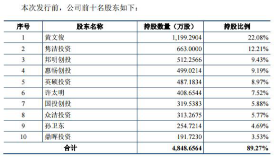 本次发行前,公司前十名股份分别为:黄文俊、隽洁投资、邦明创投、惠畅创投、英硕投资、许太明、国投创投、众洁投资、孙卫东、鼎晖投资。国投创投、鼎晖投资分别是复洁环保第七大股东、第十大股东,持股比例分别为5.88%、3.53%。