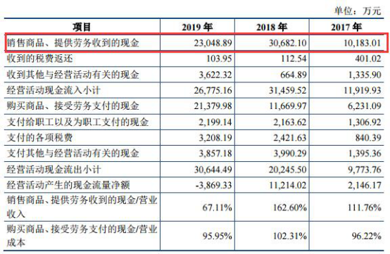 报道称,计算其含税收入与经营性债权及经营性现金流的勾稽关系,可计算出,2017年,该公司当年大概有2700万元至4400万元的现金流入来源不明。其2018年数据则出现相反的情况。2018年,大概有2700万元至4700万元的含税营收存在虚增嫌疑。
