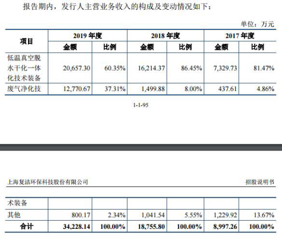 复洁环保表示,报告期内,公司主营业务收入主要来源于低温真空脱水干化一体化技术装备,占比60%-86%,以及废气净化成套技术装备,占比4%-37%。