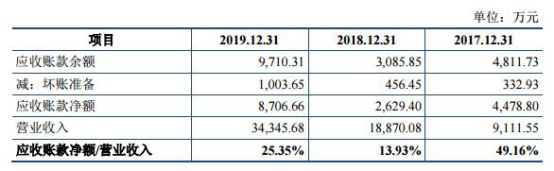 2017年末、2018年末、2019年末,复洁环保应收账款余额分别为4811.73万元、3085.85万元、9710.31万元,应收账款净额占营业收入的比重分别为49.16%、13.93%、25.35%。