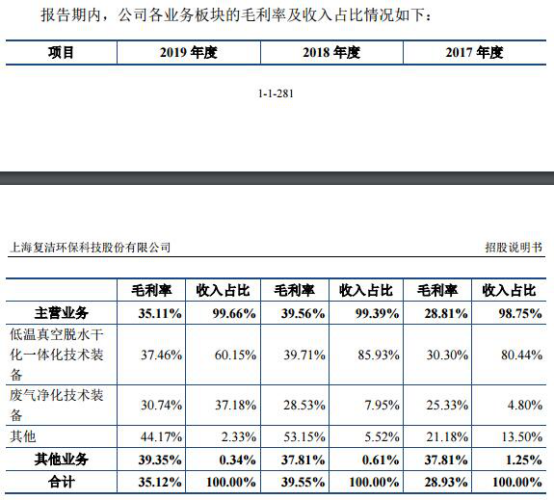 招股书显示,2017年度、2018年度、2019年度,复洁环保低温真空脱水干化一体化技术装备毛利率分别为30.3%、39.71%、37.46%。