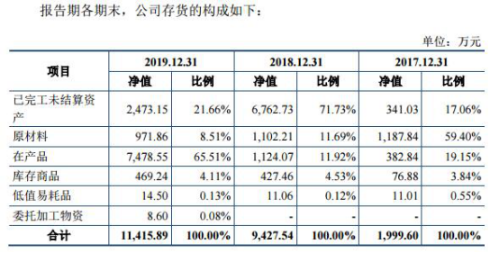 2019年末,公司存货余额较上年末有所增长,其中,已完工未结算资产金额有所下降,主要系上海虹桥污水处理厂污泥脱水干化项目,广州钟村、南村净水厂污泥脱水干化项目等项目在当年完成竣工验收,已完工未结算资产转入应收账款所致;在产品金额较上年增长较快,主要系当年末同时执行的大型项目较多,上海泰和污水处理厂污泥脱水干化项目、上海竹园一厂提标改造除臭项目、上海竹园污泥扩建除臭项目、上海大众嘉定污水处理厂污泥干化二期项目未安装设备及材料金额较大。
