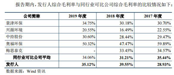 2017年度、2018年度、2019年度,复洁环保主营业务毛利率分别为28.81%、39.56%、35.11%,综合毛利率分别为28.93%、39.55%、35.12%。报告期内,同行业可比公司综合毛利率分别为35.44%、31.21%、34.06%。