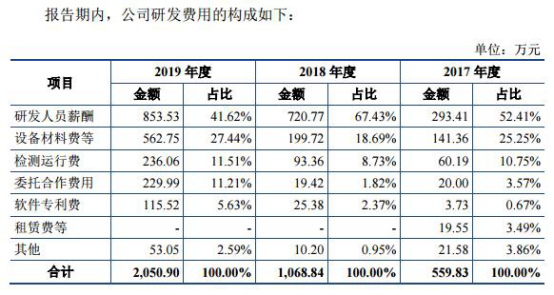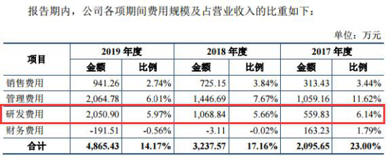 报告期内,复洁环保研发费用分别为559.83万元、1068.84万元、2050.90万元,研发费用占营业收入的比例分别为6.14%、5.66%、5.97%。同行业可比公司平均为4.23%、4.32%、5.01%。