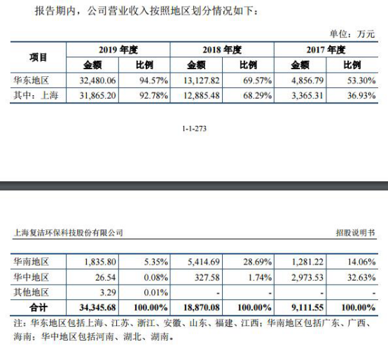 报告期内,复洁环保业务主要分布于华东与华南地区。