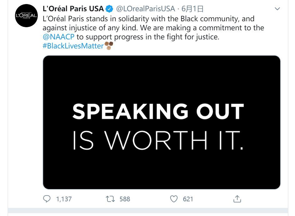 6月1日,欧莱雅美国地区的推特曾支持BLM称,“巴黎欧莱雅与黑人社区站在一起,反对任何形式的不公正。我们向@全国有色人种协进会(NAACP)作出承诺,支持为正义而战的进程。”