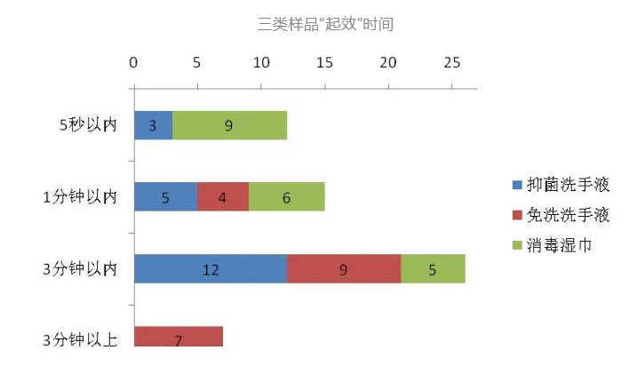 60件样品均能杀灭规定的菌落数量,但杀菌速度差异明显,其中12件样品(9件消毒湿巾,3件抑菌洗手液)杀菌最快,能在5秒内迅速杀菌,15件样品和26件样品分别在1分钟和3分钟以内杀菌,7件免洗洗手液样品杀菌略慢,用时超过了3分钟。