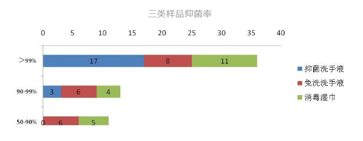 试验结果表明:3类产品都有杀菌和抑菌作用,但相比之下,抑菌洗手液和消毒湿巾在杀菌速度上更占优势,抑菌洗手液的抑菌作用也更有保障。