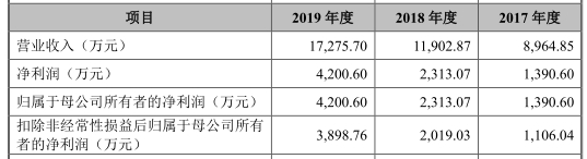 2017年至2019年,天臣医疗实现营业收入分别为8964.85万元、1.19亿元、1.73亿元,实现归属于母公司所有者的净利润分别为1390.60万元、2313.07万元、4200.60万元。