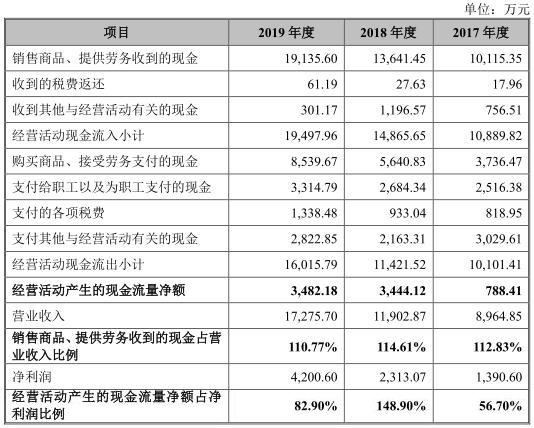 报告期内,公司经营活动产生的现金流量净额分别为788.41万元、3444.12万元、3482.18万元,占净利润比例分别为56.70%、148.90%和82.90%。