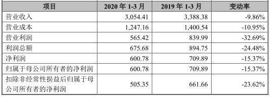 公司2020年1-3月营业收入3054.41万元,同比下降9.86%,归属于母公司所有者的净利润600.78万元,同比下降15.37%,扣除非经常性损益后归属于母公司所有者的净利润505.35万元,同比下降23.62%。