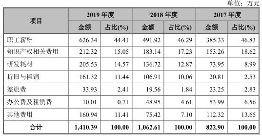 公司研发费用主要由职工薪酬、研发耗材等费用构成。报告期内,研发费用中职工薪酬的金额分别为385.33万元、491.92万元、626.34万元;研发耗材费用金额分别为73.95万元、136.72万元、205.53万元。
