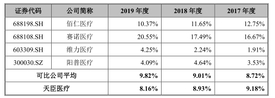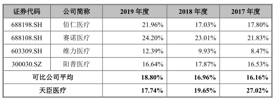 2017年至2019年,天臣医疗主营业务毛利率分别为60.83%、58.64%和60.04%,低于同行业可比上市公司平均水平,同行业可比上市公司主营业务毛利率均值分别为62.44%、61.79%、65.40%。
