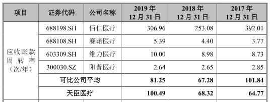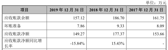 2017年至2019年,天臣医疗应收账款余额分别为161.75万元、186.70万元、157.12万元,应收账款净额分别为153.66万元、177.37万元、149.27万元,应收账款净额占当期营业收入比例分别为1.71%、1.49%、0.86%。