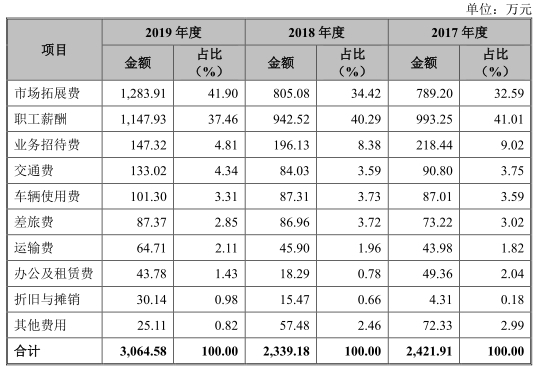 天臣医疗销售费用主要由市场拓展费和职工薪酬等费用构成。报告期内,市场拓展费分别为789.20万元、805.08万元、1283.91万元,占销售费用的比例分别为32.59%、34.42%、41.90%。