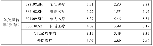 天臣医疗称,公司存货周转率低于可比公司平均值,主要系维力医疗、阳普医疗两家公司存货周转率较高。维力医疗、阳普医疗存货周转率较高主要系两家公司主要采用以销定产的生产模式,生产计划按照顾客需求及销售计划制定,而公司主要采用预测备货,会根据全年销售计划规划年度和月度生产计划,再根据每月的滚动销售预测、库存情况、发货速度、生产能力等情况对月度生产计划进行合理调整,进行月度排产备货。因此公司存货周转率低于维力医疗、阳普医疗。