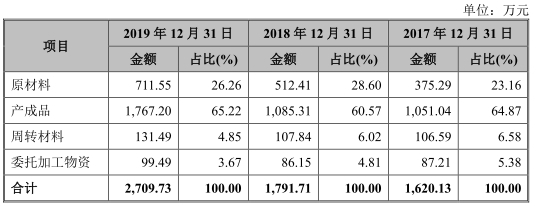 报告期内,公司存货中产成品金额分别为1051.04万元、1085.31万元、1767.20万元;原材料金额分别为375.29万元、512.41万元、711.55万元,两者合计占存货的比例在85%以上。