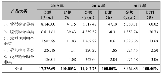 2017年至2019年,公司管型吻合器销售金额为5380.31万元、5617.47万元、8146.00万元,占主营业务收入的比例分别为60.02%、47.19%、47.15%。