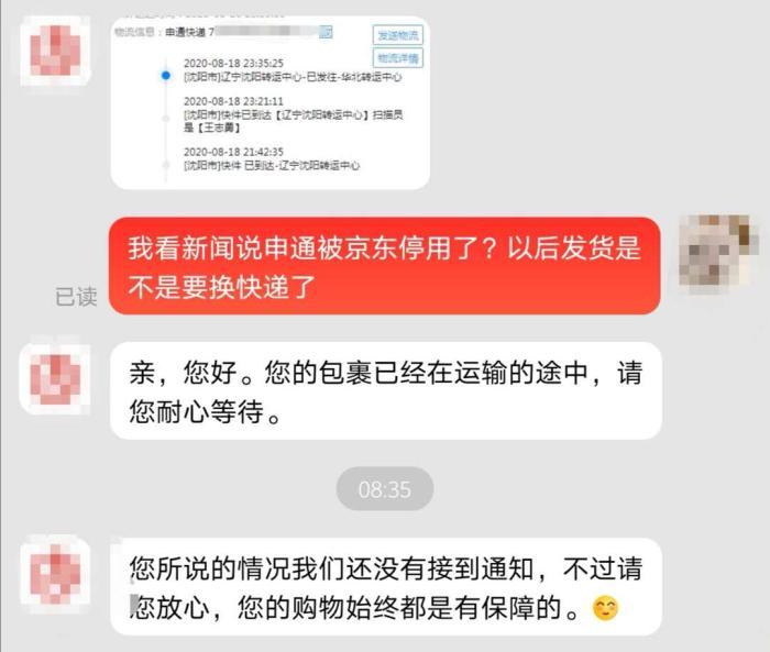 记者8月18日从京东第三方店铺下单,对方选择了申通快递仍可正常发货。被问到以后发货是否需要更换快递公司时,客服表示,“您说的情况我们还没有接到通知。请您放心,您的购物始终都是有保障的。”